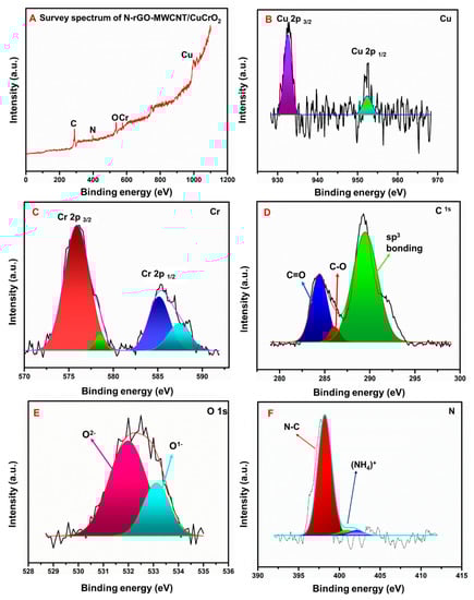 (A) XPS overall spectra of N-rGO-MWCNT/CuCrO2, (B) Cu, (C) Cr, (D) C, (E) O, (F) N.
