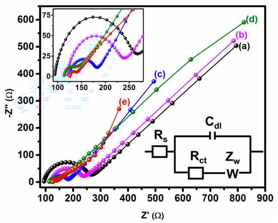 EIS studies of (a) bare GCE, (b) GCE/MWCNT, (c) GCE/CuCrO2, and (d) GCE/N-rGO, and (e) GCE/N-rGO-MWCNT/CuCrO2 modified electrodes in 0.1 M KCl at 5 mM [Fe(CN)6]3−/4−. (Inset. Enlarged image of EIS spectra).