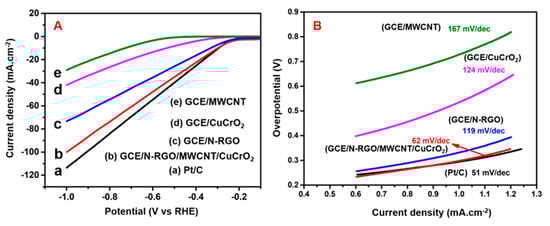 (A) Polarization curves of (a) Pt/C, (b) GCE/N-rGO-MWCNT/CuCrO2, (c) GCE/N-rGO, (d) GCE/CuCrO2, (e) GCE/MWCNT electrodes in 0.5 M H2SO4 at the scan rate of 5 mVs−1. (B) Tafel plots of Pt/C, GCE/N-rGO-MWCNT/CuCrO2, GCE/N-rGO, and GCE/CuCrO2, GCE/MWCNT electrodes.