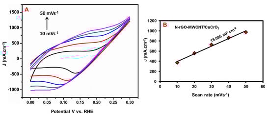 To identify the electrochemically active surface areas (ECSA) for electrodes were identified by Cyclic Voltammetry (CV) curves were recorded under non-Faradaic potential range. The electrochemical double-layer capacitance (Cdl) is used to evaluate the ECSA of the electrode. As mentioned in Figure 9A, the CV response of N-rGO-MWCNT/CuCrO2 was identified at various scan rates (10–50 mVs−1). The capacitive currents of the electrode were calculated in a potential range and the faradic process was not observed. The obtained CV peak currents were plotted for different scanning rates and the slope is shown in Figure 9B. The N-rGO-MWCNT/CuCrO2 electrodes have the highest Cdl versus RHE compared with other electrodes, inferred that the efficient active sites, high surface area, and their remarkable catalytic activity for HER.