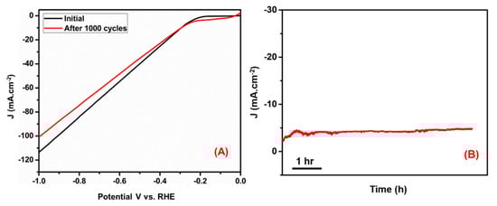 The long-term stability performance of the N-rGO-MWCNT/CuCrO2 catalyst was examined by the CV and chronoamperometry test. The stability of the N-rGO-MWCNT/ CuCrO2 catalyst was studied under continuous tests during the HER process. As mentioned in Figure 10A, the cathodic current polarization curves show a small change and consistently high current density after 1000 cycles. The negligible variations between the starting CV curves and after 1000 cycles of CV curves, these CV studies suggest that the N-rGO-MWCNT/CuCrO2 has excellent electrochemical stability in HER.