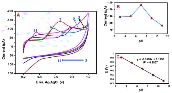 The electrolyte pH condition is a significant parameter for the electrochemical sensor. Figure 12A shows, the effect of electrolyte pH value on the electrochemical detection of BPA by using CV. The electrolyte pH changed from 3.0 to 11.0 enhanced the BPA detection response, and achieved a higher peak current at pH of 7.0, after which it decreased (Figure 12B). This finding shows that hydronium ions play a vital role in BPA oxidation. The anodic peak potential of the electrolyte solution depends on the pH. Hence, the pH 7.0 was fixed as the electrolyte pH condition for further experiments. Moreover, Figure 12C shows, increasing the electrolyte pH condition; the anodic peak potential (Epa) of BPA detection was moved to the negative side and obtained the following linear correlation coefficient value of 0.9957 and slope value of –59.8 mV/pH. The slope value was almost similar to the theoretical value due to the deprotonation involved in the oxidation at pH 7.0. Based on the Nernst equation and the slope value, suggested that the same number of electrons and protons were involved in the detection of BPA [48,49,50].