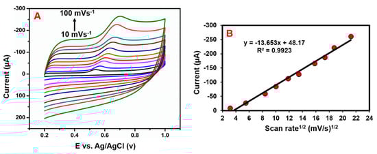 (A) CV curves of GCE/N-rGO-MWCNT/CuCrO2 electrode in the presence of 1.0 µM BPA in 0.05 M PBS (pH 7.0) were observed at various scans rates ranging from 10–100 mVs−1. (B) Correlations between the peak currents and the square root of the scan rate.