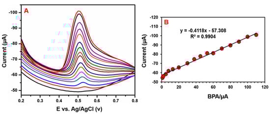 Differential pulse voltammetry (DPV) is a more sensitive tool for identifying linearity, sensitivity, and electrode detection limits than other cyclic voltammetry systems. The electrocatalytic effect of GCE/N-rGO-MWCNT/CuCrO2 on the BPA oxidation had been identified by the DPV technique. Figure 14A shows DPV responses of BPA detection over the GCE/N-rGO-MWCNT/CuCrO2 in 0.05 M PBS with various concentrations addition of BPA. The relationship between the concentration and peak oxidation currents of BPA on the GCE/N-rGO-MWCNT/CuCrO2 was analyzed here by DPV and the result is mentioned in Figure 14B. The peak current of BPA oxidation linearly increased to increase the BPA concentration within the 0.05–10 μM range. Besides, the relation amid the concentration of BPA and the peak current of oxidation was seen as Ipa (μA) = −0.4118 + 57.308 (R2 = 0.9904). Also, the limit of detection (LOD) was calculated by the following formula LOD = 3 S/b; here, b is the slope of the calibration curve and S is the normal peak current deviation. The LOD was measured to be 0.033 μM and the electrode sensitivity was 1.3726 µA µM−1 cm−2, which exceeded the various forms of BPA sensors previously mentioned, as defined in Table S1. The superior electrocatalytic activity of CuCrO2 and the large specific surface area of the N-rGO-MWCNT composite establish strong electron transfer capability and sensitivity of GCE/N-rGO-MWCNT/CuCrO2 electrode. Therefore, the electrochemical results show that GCE/N-rGO-MWCNT/CuCrO2 electrode had a linear concentration range, a lower detection limit, and an appropriate sensitivity for BPA detection. Thus, the GCE/N-rGO-MWCNT/CuCrO2 electrode can be used for the real-time detection of trace amounts of BPA in food samples.