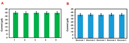 (A) The bar diagram for repeatability of the GCE/N-rGO-MWCNT/CuCrO2 electrode with the same electrode. (B) The bar diagram for reproducibility of the GCE/N-rGO-MWCNT/CuCrO2 electrode.