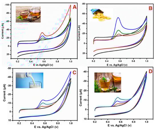 Electrochemical detection of BPA from different food samples such as (A) green tea, (B) chips, (C) milk, (D) coffee sample using GCE/N-rGO/MWCNT/CuCrO2 electrode.