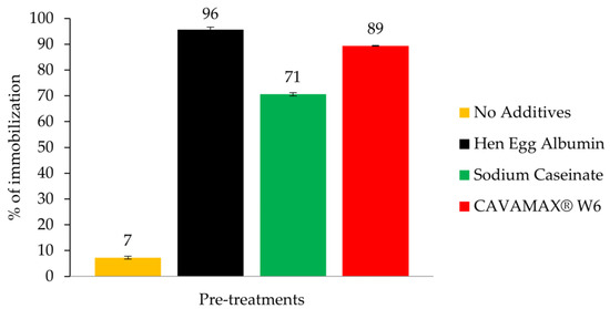Immobilization yield of Rhizopus oryzae lipase (RoL) immobilized on no additives and additive-treated polypropylene support. Additives use in this study were hen egg albumin, sodium caseinate and CAVAMAX® W6. The measurement of yield of immobilization was conducted in triplicate and relative activities are measured as mean values ± standard error.