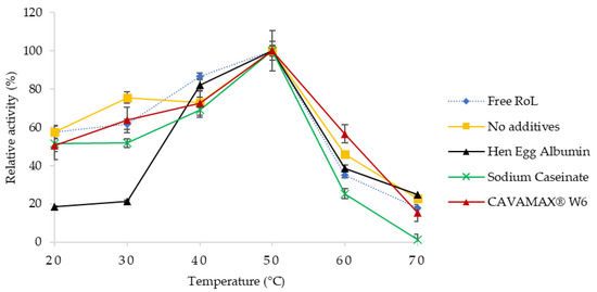 Temperature profile of free and immobilized RoL on polypropylene support with and without additives that include hen egg albumin, sodium caseinate and CAVAMAX® W6. The optimum temperature of immobilized RoL was measured at different temperatures ranging from 20 to 70 °C. All measurements were carried out in triplicate and calculated as mean ± SE (n = 3).