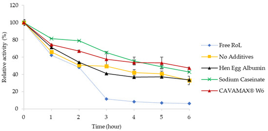 For the analysis of thermal stability (Figure 3), incubation on free and immobilized RoL was performed at 50 °C and assayed on an hourly basis up to 6 h. The relative activity of immobilized RoL appeared to decline gradually throughout 6 h of incubation. Accordingly, the half-life of free RoL was observed after 2 h of incubation, similar to the half-life of immobilized RoL on support without additives and immobilized RoL with hen egg albumin as the additive to the support. As for immobilized RoL on a support treated with sodium caseinate and CAVAMAX® W6 the half-life at 50 °C was found to be 5 and 6 h, respectively.