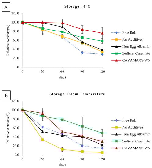 Storage stability of free and immobilized RoL on polypropylene support with and without additives that include hen egg albumin, sodium caseinate and CAVAMAX® W6. The data were a display of storage activity for 120 days in (A) 4 °C and (B) room temperature. The relative activity at 0 days of storage was referred to as 100%. All measurements were carried out in triplicate and data were calculated in mean ± SE (n = 3).