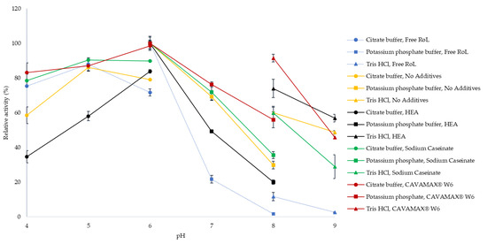 pH profile of free and immobilized RoL on polypropylene support with and without additives that include hen egg albumin, sodium caseinate and CAVAMAX® W6. Optimum pH was determined based on the activity of free and immobilized RoL at various pH comprising (●) 50 mM sodium citrate buffer (pH 4–5), (■) 50 mM potassium phosphate buffer (pH 6–8) and (▲) 50 mM Tris-HCl buffer (pH 8–9). The relative activity at different pH values was calculated by setting the optimum pH as 100%. All measurements were carried out in triplicate and data were calculated in mean ± SE (n = 3).