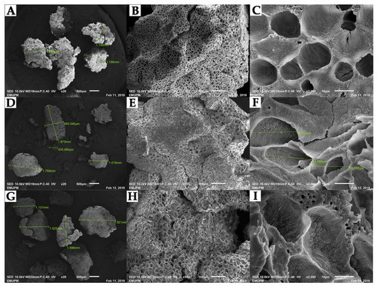 SEM micrographs as disclosed in Figure 6 revealed the morphology of polypropylene supports having pores structure of nonuniform size. Accordingly, the difference in the size of the particle of the support on the reference of before and after immobilization was found to be between 1.131–1.910 mm. The morphology of the support was also reported to be similar to Silva et al. 2015. After immobilizing RoL on treated support, the area of porosity became less obvious (Figure 6G–I). This indicates that the void areas inside the pores are filled up with lipases.