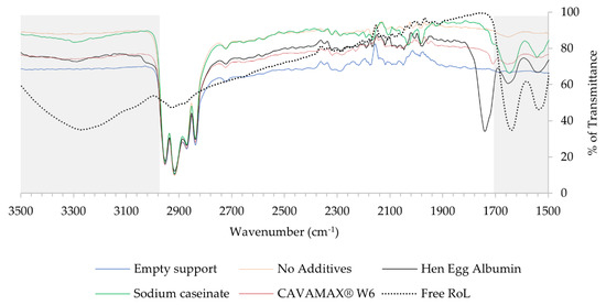 Comparison of infra-red spectra of free RoL, empty polypropylene support and immobilized RoL on polypropylene support with and without additives. The spectral changes (grey shade) harbouring bands from 3500–3000 cm−1 indicating the N–H bending and 1700–1600 cm−1 for the stretching of C=O.