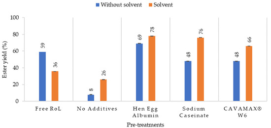The synthesis of ethyl-oleate from oleic acid and ethanol (ratio 1:2) using free and immobilized RoL was evaluated with and without n-hexane. Compared to other organic solvents, n-hexane was selected as the main solvent for the catalytic reaction due to hydrophobicity factor that increased the stability of lipase [15]. Based on Figure 8, it was capable of achieving high conversion of ester with the use of immobilized RoL. With the presence of additive on the support such as hen egg albumin, a higher ester yield was attained of 78%. Other additives such as sodium caseinate contributed to 76% of ester while CAVAMAX® W6 contributed to 66% of ester in the enzymatic esterification with n-hexane. Unlike the immobilized RoL, free RoL failed to convert ester in organic media, which leads to low conversion of ester (36%) as compared to RoL without organic solvent that yielded ester at 59%. Such an observation on ester yields indicates the effect of organic solvent towards enzyme aggregation. To avoid lipase aggregation, immobilized RoL was utilized as the lipase was configured to be more accessible to substrate [16].