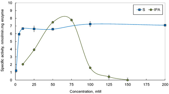 In the present study, the enzyme activity was found to increase with the IPA concentration up to approximately 75 mM (Figure 1). The enzymatic activity decreased abruptly at IPA concentrations higher than 75 mM, and was completely inhibited at 150 mM IPA. Chen et al. also observed a decrease in transaminase activity with increasing IPA concentrations in thermodynamic stability tests [40]. An amine donor-induced inactivation mechanism was proposed by Börner et al. [41]. In summary, inactivation induced by an amine donor was hypothesized to involve the accumulation of the less stable aminated enzyme–PLP complex, and that its dissociation results in the rapid unfolding of the produced apoenzyme. Increasing the PLP supply could enhance stability but would reduce transamination activity.
