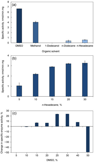 Using 5% (v/v) of the organic solvents, the highest TR8 activity was observed using DMSO (6.7 nmol min−1 mg−1; Figure 2a), followed by methanol (4.0 nmol min−1 mg−1). DMSO is a dipolar aprotic solvent, which contains a strong polar sulfoxide group and two hydrophobic methyl moieties, widely used in industry because of its low toxicity. Methanol is a hydrogen-bond-donating co-solvent, whereas DMSO is a hydrogen-bond-accepting co-solvent. These solvent characteristics can affect enzyme activity and/or stability. The enzyme activity was considerably lower (<0.62 nmol min−1 mg−1; Figure 2a) in the presence of the three immiscible solvents than in the presence of the water-miscible organic solvents. This behavior may have resulted from mass-transfer limitations in the two-phase systems that reduced the substrate concentration in the water phase, or from molecular and/or phase toxicity caused by the organic solvent towards the enzyme. The immiscible organic solvents tested are more biocompatible (log P > 4) than those miscible, and their solubility in water is very low (<0.04 wt.%) [44]; therefore, mass transfer should have been responsible for limiting the bioconversion. In fact, when the amount of n-hexadecane in the system was increased from 5 to 20% (v/v), TR8 activity increased three-fold (Figure 2b).