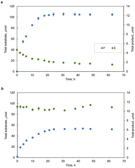 During the first test of the two-phase system, no DMSO was added to the aqueous phase because the S supply in the organic phase was considered to be sufficient. Although 6.11 µmol of P were detected in the system at 24 h of reaction, P production nearly stopped thereafter (Figure 3b). In the biphasic system, the reaction reached equilibrium 6 h later, but the quantity of P was approximately half of that produced in the single aqueous system (Figure 3a,b).