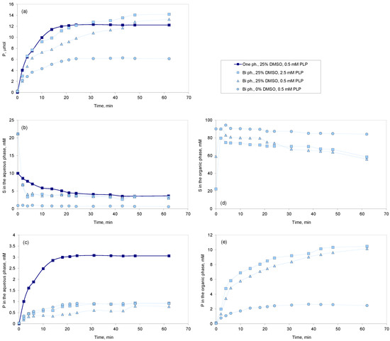 For the two-phase systems, adding DMSO and increasing the PLP concentration resulted in a 2.3-fold increase in P production over that obtained in the system with 0.5 mM PLP and without DMSO, at 62 h of reaction (Figure 4a). Optimizing the conditions resulted in 15.9% more P being produced in the bi-phasic system than in the one-phase system. At 24 h of reaction, similar product concentrations (approximately 12 µmol) were obtained for the one- and two-phase systems. However, optimizing the quantities of DMSO and PLP in the two-phase system prevented the reaction from terminating after 24 h, which occurred in the case of the one-phase system. The concentration of P in the organic phase of the biphasic system steadily increased up to the end of the experiment (Figure 4e).