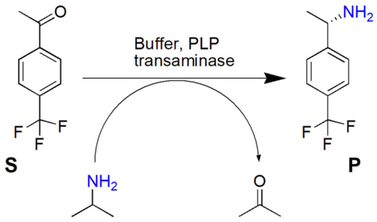 Enzyme-catalyzed asymmetric transamination of 4′-(trifluoromethyl)acetophenone (S) with isopropylamine (IPA) as an amine donor to produce (S)-1-(4-trifluoromethylphenyl)ethylamine (P), and acetone (co-product).
