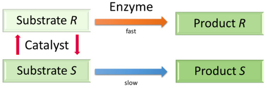 To date, over 80% of to date medicines contain chiral building blocks. Thus, the production of enantiopure materials is vital for the pharmaceutical and related industries [1]. The synthesis of pure enantiomers is very elegant, but costs can be prohibitively high, and conventional separation methods of racemates often remain a practical solution [2,3,4]. During the past three decades, however, a kinetic resolution (KR) and, more recently, its dynamic-kinetic mode (DKR) emerged as their viable alternatives [5,6]; these approaches are already applied in the production of chiral amines and alcohols with the use of ruthenium complexes [7,8]. In DKR, the slowly reacting enantiomer of the racemic mixture is catalytically transformed (racemized) into that preferentially converted isomer, whereas in KR, in principle, it is left unused [2,9,10]. In effect, the maximum product yield in DKR can reach 100%, whilst in KR it is 50% (Figure 1).