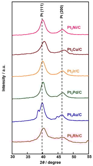 The mean crystallite size of each Pt3M nanoparticle loaded on ketjen black was estimated with Scherrer’s equation (Equation (5)) for the (111) peak in each XRD pattern assuming a single PtxM phase, and summarized in Table 1.
