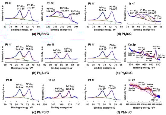 Pt4f and Rh3d, Au4f, Pd3d, Ir4f, Cu2p or Ni2p core level spectra for (a) Pt3Rh/C, (b) Pt3Au/C, (c) Pt3Pd/C, (d) Pt3Ir/C, (e) Pt3Cu/C and (f) Pt3Ni/C catalysts.