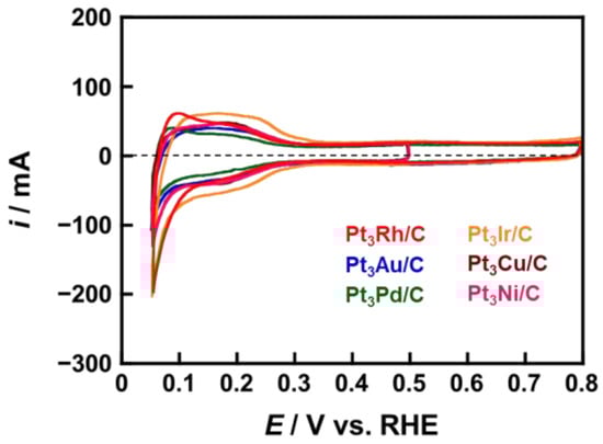Figure 3 shows cyclic voltammograms (CVs) of the Pt3M/C electrodes after initial activation to clean the electrode surface before evaluating the electrochemical TL hydrogenation activity. The initial activation was performed by 100 cycles of potential sweep over the potential range of 0.05–1.2 V vs. RHE for the Pt3Rh/C, Pt3Au/C, Pt3Pd/C and Pt3Ir/C electrodes, and 0.05–0.8 V vs. RHE for the Pt3Cu/C and Pt3Ni/C electrodes because Cu and Ni were easier to be oxidatively dissolve than the noble metals. In general, a polycrystalline Pt electrode has two couples of redox peaks due to hydrogen adsorption/desorption between 0.05 and 0.4 V vs. RHE [44,45]. Each Pt3M electrode also had these redox peaks, as shown in Figure 4, although they were not distinctly separated. The electric charge for the desorption of atomic hydrogen (QH-des) for a polycrystalline Pt is 210 μC cm−2 [45], indicating that an atomic hydrogen is adsorbed on a Pt atom. The oxidation peaks due to hydrogen desorption for pure Rh, Pd and Ir electrodes partly overlap those for the polycrystalline Pt electrode [46,47], but not for pure Au, Cu and Ni electrodes. If binary Pt-based alloys maintain the fcc structure and the atomic radii of Pt and foreign metals are similar to each other, the QH-des value of 210 μC cm−2 is often used, supposing that each constituent (M) has a stoichiometric composition of M:H = 1:1 [48]. The Pt3Rh, Pt3Pd and Pt3Ir alloys have the fcc structure, as can be seen from Figure 1. So, the electrochemical surface areas (ECSAs) of these electrodes were calculated with the QH-des values estimated from their CVs in Figure 3 as follows, supposing 210 μC cm−2.