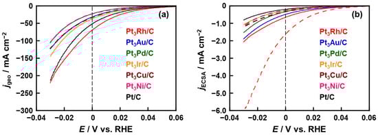 Figure 4 shows the linear sweep voltammograms (LSVs) of activated Pt3M/C (M = Rh, Au, Pd, Ir, Cu and Ni) and commercial Pt/C electrodes at a sweep rate of 50 mV s−1 when neat TL was supplied into the cathode compartment of the electrochemical hydrogenation cell. The initial activation was performed by 100 cycles of potential sweep over the potential range of 0.05–1.2 V vs. RHE for the Pt3Rh/C, Pt3Au/C, Pt3Pd/C, Pt3Ir/C and Pt/C electrodes, and 0.05–0.8 V vs. RHE for the Pt3Cu/C and Pt3Ni/C electrodes. Figure 4a,b are represented by the geometric current density (jgeo), and current density per ECSA (jECSA) or specific activity (SA), respectively. In Figure 4a, the onset potential of jgeo (Eonset) for each LSV is summarized in Table 3. All Eonset values were more positive than 0 V vs. RHE or the standard potential for HER, suggesting that the cathodic current density of each LSV is attributed to the electrochemical TL hydrogenation [49].