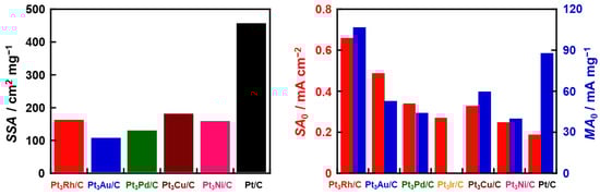 Mass activity (MA), cathodic current density per mass of Pt3M alloy, is also another measure of electrochemical TL hydrogenation activity. The higher MA leads to the smaller catalyst amount, so the higher MA is desirable from a practical point of view. To calculate MA, it is not suitable to use the initial loading mass of metals because the second metals other than Au can oxidatively dissolve during the initial activation. The metal loading mass after the LSV measurement (ma) can be calculated using the metal loading mass and bulk composition of the as-prepared Pt3M/C catalyst and the bulk composition after the LSV measurement (Table 2), assuming that only the second metal constituent in each Pt3M alloy dissolves [24]. The ma value of each Pt3M/C electrode is summarized in Table 3. In addition, the MA0 and specific surface area (SSA) for each Pt3M/C catalyst were calculated using the ma value, and shown in Figure 5. As can be seen from Figure 5, the MA0 value (107 mA mg−1) of the Pt3Rh/C electrode was the highest in the Pt3M/C electrodes, and higher than that (88 mA mg−1) of the commercial Pt/C electrode. The MA0 value is a product of SA0 and SSA. For SSA, the Pt/C electrode (456 cm2 mg−1) was much larger than the Pt3Rh/C electrode (162 cm2 mg−1), because the mean size (ca. 2.6 nm [49]) of Pt nanoparticles is smaller than that (4.4 nm) of Pt3Rh nanoparticles. For SA0, the Pt3Rh/C electrode was much larger than the Pt/C electrode. Overall, the increase in SA0 outweighs the decrease in SSA, leading to the increase in MA0. Therefore, the electronic modification of Pt by alloying with Rh has a great influence on the high MA0 for Pt3Rh/C electrode.