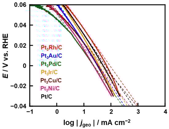 To discuss the reaction mechanism for the electrochemical TL hydrogenation on each Pt3M/C electrode, the Tafel slope was evaluated. Figure 6 shows the Tafel plots made from the LSVs in Figure 4, and the Tafel slopes are summarized in Table 3. Electrochemical TL hydrogenation is known to consist of the following elemental reactions [19,20].
