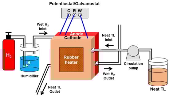 An electrochemical hydrogen pump TL hydrogenation system used in this study is shown in Figure 7. Neat TL was supplied to the cathode compartment at 5 mL min−1. LSVs were measured at 1 mV s−1 from an open circuit potential to −0.03 V vs. RHE to evaluate the activity of each catalyst for electrochemical TL hydrogenation. All potentials were corrected by IR drop.