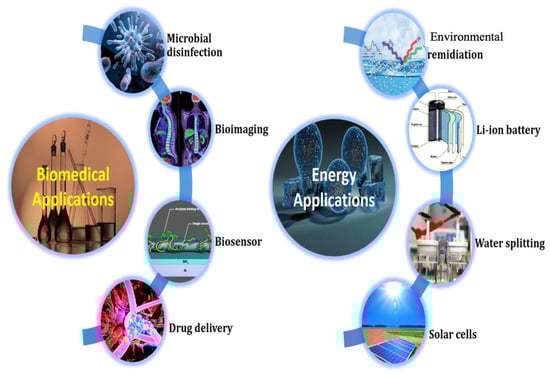 Smart and multifunctional materials are rapidly transforming the energy and biomedical fields [1,2,3]. The ability to combine atoms, molecules, structures, and processes in new and exciting ways has led to materials that possess advantageous combinations of physicochemical, biological, optical, electrical, and mechanical properties [4,5,6]. Multifunctional materials “activated” by light (photocatalysts) show promise for use in renewable energy technologies, H2 generation, solar cell battery systems, and environmental remediation [7,8]. In addition, these materials can also be designed to provide new functions associated with antibacterial activity, self-cleaning, self-healing, super-hard, and solar reflectivity for desired end-use applications [9,10,11,12]. Some of the applications of multifunctional materials in revolutionizing energy and biomedical research are shown in Figure 1 [13].
