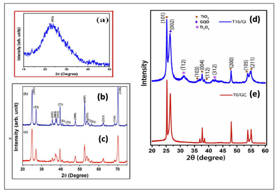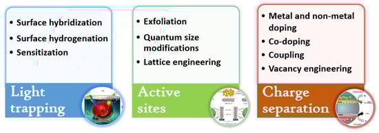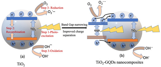 Surface modifications, such as increasing the surface roughness, enable broader light utilization by photon scattering and trapping. Surface hydrogenation is a bandgap engineering strategy to improve the light absorption of TiO2 [55]. Sensitization strategies of TiO2 with organic and inorganic compounds expand the absorption spectrum range of the photocatalyst [20]. Exfoliation by chemical and mechanical processes and quantum engineering aimed at size reduction are some of the most extensively researched strategic methods aimed at increasing the number of catalytic active sites. Coupling and doping of TiO2 with metal, nonmetal, ions, or other semiconductors provides trap sites and aids in efficient charge carrier separation. In this review, we will be focusing on the doping, co-doping, and coupling of TiO2 nanomaterials with GQDs [20].