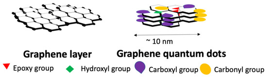 Graphene quantum dots (GQDs) are zero-dimensional (0D) derivatives of graphene with a diameter of up to ~10 nm (Figure 4) [56]. Combining the structural characteristics such as the atomically thin, planar shapes of graphene with quantum confinement and surface/edge effect of CDs, GQDs possess many unique properties, such as high surface area, tunable photoluminescence, aqueous dispersion, chemical inertness, biocompatibility, and low toxicity [57,58,59,60].