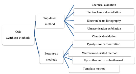 Methods of GQDs synthesis can be categorized into two main groups, namely bottom-up and top-down production methods, as shown in Figure 5. Top-down procedures include chemical oxidation, electrochemical exfoliation, laser exfoliation, and chemical exfoliation [61,62]. These are applied by incising large graphene sheets, CNTs, carbon fibers, or the graphite into smaller segments of graphene sheets. These methods are considered the most appropriate methods for mass production. Bottom-up methods consist of GQDs synthesis using polycyclic aromatic compositions or molecules with aromatic structures such as fullerenes via pyrolysis or carbonization [63].