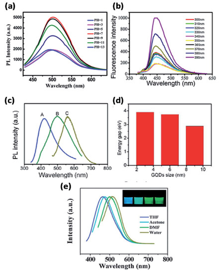 Fluorescence spectra of GQDs at (a) different pH levels, (b) different excitation wavelengths, (c) and (d) different sizes of GQDs and bandgap energy, and (e) different solvents. Reprinted from [23]; Published by The Royal Society of Chemistry.