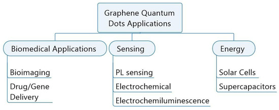 The wide-ranging properties of GQDs make them suitable for use in diverse areas, among which biomedical, sensing, and energy applications can be mentioned. The specific applications in all these areas are listed in Figure 7 [56,66].