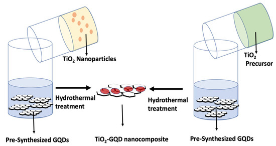 The most common methods to synthesize TiO2-GQD-doped nanocomposites are the hydrothermal method, ultrasound assisted hydrothermal method, microwave method, and physical mixing methods which involve mechanical stirring or ultrasound treatment to mix the TiO2 and GQD nanomaterials [69]. These methods are generally used to synthesize the physical/chemical mixture of TiO2 and GQDs nanoparticles. If the concentration of one of the nanomaterials (in the composite material) is less than ~5%, the obtained material can be called a doped material.