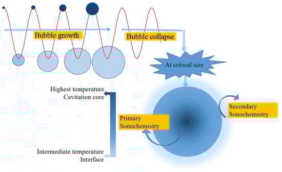 Ultrasound has been very useful in the synthesis of a wide range of nanostructured materials, including high-surface-area transition metals, alloys, carbides, oxides, and colloids. The chemical effects of ultrasound do not come from a direct interaction with molecular species. Instead, sonochemistry arises from acoustic cavitation: the formation, growth, and implosive collapse of bubbles in a liquid. Cavitational collapse produces intense local heating (5000 K), high pressures (1000 atm), and enormous heating and cooling rates (>109 K/s) [77]. A scheme of the reactions occurring during the sonochemical process is depicted in Figure 9. The sonochemical method has been applied to prepare TiO2-GQDs nanocomposites by Sowba et al. In this method, pre-synthesized TiO2 and GQD nanoparticles are mixed in water and subjected to an ultrasound frequency of ~40 kHz for 1 h. These suspensions are then used for photocatalytic degradation reactions [78].