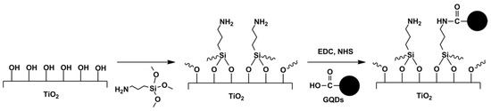 Reaction scheme for the loading of GQDs onto TiO2 nanotube arrays (TNAs) via covalent bonding. Reprinted from [80].