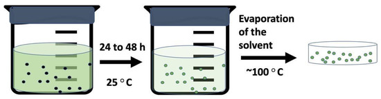 Wet impregnation is a well-known method in the development of heterogeneous catalysts. This is a procedure whereby a certain volume of solution containing the precursor of the active phase is placed into contact with another active solid phase (support), which, in a subsequent step, is dried to remove the imbibed solvent [83]. Thus, this method can be used to prepare supported and mixed catalysts. A schematic overview of this process is given in Figure 11. Yu et al. have developed TiO2-GQDs nanocomposites by this method [84]. In this method, TiO2 nanoparticles are immersed in a 0.01-mg/mL graphene oxide quantum dot (GOQD) aqueous solution (15 mL) for 5 h. After slow evaporation at 40 °C, the GOQD-TiO2 composites are produced. Then, the black GQDs-TiO2 was obtained through annealing treatment of GOQD-TiO2 at 450 °C in an argon stream for 1 h.