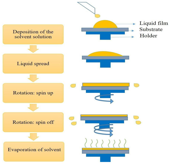 Spin-coating is a low-cost method used to deposit uniform thin films on the flat substrates. When a solution of a material is spun on a substrate at high speed, the centripetal force and the surface tension of the liquid can create an even covering of the solution on the substrate. After any remaining solvent has evaporated, spin-coating results in a thin film ranging from a few nanometers to a few micrometers in thickness [90]. A schematic overview of spin-coating method is shown in Figure 12. Bayat et al. used a hydrothermal method to synthesize GQDs and to grow TiO2 nanoflowers (NFs) on Fluorine doped Tin Oxide (FTO) glass. Various amounts of GQDs were dropped on the TiO2 NF substrate a under rotation speed and deposition time of 3000 rpm and 3 min, respectively [91]. Then, these GQDs-TiO2 photoanodes were heated for 30 min in an oven at 200 °C for better tenacity of GQDs on the TiO2 NFs’ surfaces.