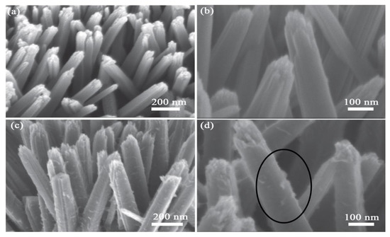TNAs were firstly immersed in 0.2 wt % (3-aminopropyl) trimethoxysilane (APTMS) in toluene for 3 h, rinsed with toluene, and dried. The modified TNAs were then immersed in a beaker containing a solution of GQDs (1 mg·mL−1), ethyl(dimethylaminopropyl)carbodiimide (EDC), and N-hydroxysuccinimide (NHS) for 4 h. The foils were then sonicated in DI water, rinsed with DI water, and dried in air.