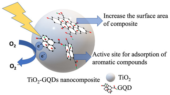 The promise of multifunctional materials for catalysis is vast; however, integrating different properties and functions into a single-material system is a fundamental challenge that needs to be repeatedly overcome for the advancement of photocatalysis [10,14,15]. For example, titania (TiO2) is one of the most widely used photocatalysts in the field of environmental applications due to its wide bandgap, photochemical stability, nontoxic nature, and low cost [16,17]. However, the inherent optical and electronic properties of TiO2 are insufficient to achieve adequate catalytic efficiency for energy harvesting and contaminant removal [18]. The insufficient catalytic efficiency of TiO2 is attributed to (1) its very limited capability to use solar energy and (2) the rapid recombination of its photogenerated electron-hole pairs during catalytic processes [19,20]. Similarly, carbon-based nanomaterials (CNMs) have been at the frontier of materials science over the last few decades. Examples of impactful carbon-based nanomaterials include carbon nanotubes (CNTs) and graphene-inspired nanomaterials [graphene sheets, graphene oxide; graphene quantum dots and reduced graphene oxide; (RGO)] [21,22]. Among all the carbon-based materials, immense efforts related to photonics have been focused on graphene quantum dots (GQDs) because they have a great combination of characteristics observed in graphene and carbon dots (CDs) [23,24]. GQDs possess many unique properties, such as high surface area, tunable photoluminescence, aqueous dispersion, chemical inertness, and low toxicity [25,26]. Despite these characteristics, GQDs are not efficient in delivering some of the key characteristics required for catalysis, such as possessing a wide bandgap; having the ability to maintain high electron-hole pair separation and transfer efficiency; exceptional heat transfer and electron transport properties (as in TiO2 and ZnO semiconductors); and having the capability to donate metal ions (as in Ag+) for biocidal applications [27,28]. Hence, the homogeneous combination of at least two dissimilar nanomaterials, such as TiO2 and graphene-based materials, with diverse properties and complementary functionalities, holds great promise for addressing the growing needs of energy and biomedical applications [29,30,31,32]. Such materials, which are formed by the mixture of two or more components (non-gaseous), in which at least one of them has a nanoscale structure, are called nanocomposites.