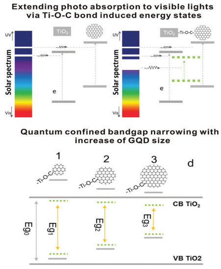 In particular, TiO2 in combination with GQDs highlights new perspectives in the field of photocatalysis for its large specific surface area, flexible structure, extraordinary mobility of charge carriers at room temperature, high thermal and electrical conductivities, and high chemical stability [33,34]. In addition to these, combining these materials leads to the quantum confined bandgap narrowing mechanism. Through this, absorption of these UV absorbers (namely GQDs and TiO2) can be easily extended into the visible range [35]. Such mechanisms may be of great importance for environmental remediation and solar fuel production. Moreover, the utilization of GQDs to modify TiO2 nanoparticles can lead to interesting materials that are beneficial for many biomedical applications, such as tissue engineering, biosensing, molecular imaging, and drug and gene delivery [36]. Hence, in this review, we summarize the recent research advances of TiO2-GQDs nanocomposites as one of the most promising new generations of multifunctional materials. We begin by explaining the basic properties and applications of pure TiO2 and GQD nanoparticles. Then, we focus on some important aspects of TiO2-GQD nanocomposites, such as their synthesis methods, characterization techniques, and applications.