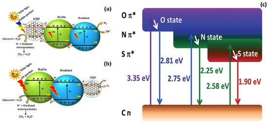 - Raghavan, A.; Sarkar, S.; Nagappagary, L.R.; Bojja, S.; Venkatakrishnan, S.M.; Ghosh, S. Decoration of Graphene Quantum Dots on TiO2 Nanostructures: Photosensitizer and Cocatalyst Role for Enhanced Hydrogen Generation. Ind. Eng. Chem. Res. 2020, 59, 13060–13068. [Google Scholar] [CrossRef]
