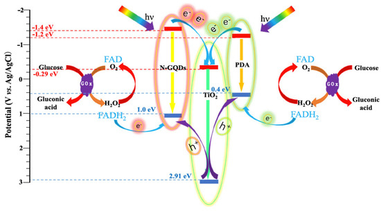 Yang et al. developed a photoelectrochemical glucose sensor using the combination of TiO2-GQDs and polydopamine (PDA) nanocomposites [76]. In this research, titanium nanoarray (TiO2-NA)-PDA nanocomposites are prepared by an electrodeposition method. Further, the TiO2-NA-PDA electrode is combined with the GQD nanoparticles using the microwave method. The TiO2-NA-PDA substrate is immersed in a solution of 2 mL of GQDs, 3 mL of water, and 30 mL of ethylene glycol and subjected to microwave treatment for 1 min. Here, ethylene glycol is used as a dielectric material. The obtained substrate is rinsed with ethanol and water for further usage.