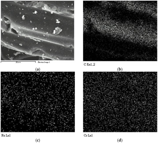 The SEM image and maps of elements for the overall molar ratio of Cs/Ru = 6 are shown in Figure 2a–d. The SEM image given in Figure 2a shows an uneven and wavy surface structure of Ru-Cs/C particles with a near horizontal surface texture. The bright spots for the map of element C in Figure 2b reflect the surface texture characteristics in Figure 2a. Both the uniformities of bright spots for the maps of elements Ru and Cs in Figure 2c,d, respectively, are good throughout the whole pictures. This indicates that the Cs particles could be uniformly distributed on the carbon support during the blending processes for mixing the promoter Cs with the catalyst Ru/C, even at a higher molar ratio of Cs/Ru = 6.