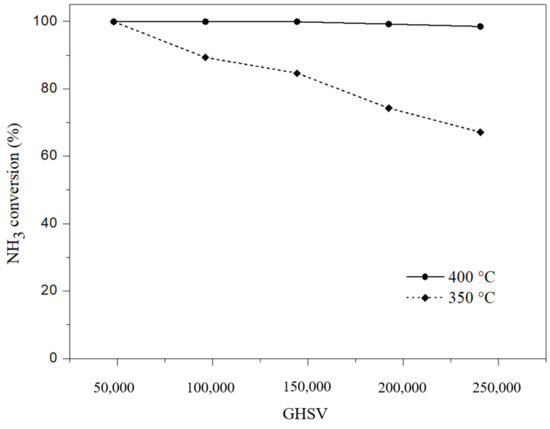 (3) At a molar ratio of Cs/Ru = 4.5, all the ammonia conversions at 400 °C are near 100% for GHSV from 48,257 to 241,287 mL/(h·gcat). However, the ammonia conversion at 350 °C is quickly decreased with the increasing of GHSV.