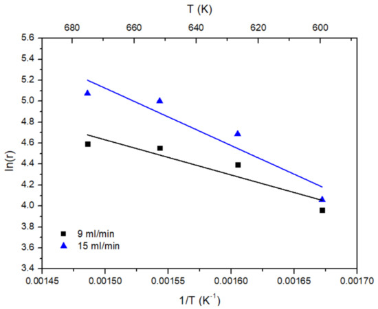 The H2 production rate, which is expressed by symbol r in units of m molH2/(min·gRu), in the ln scale as a function of temperature (1/T) for the inlet flow rate of 9 and 15 mL/min are given in Figure 8. This plot is used to estimate the activation energy, E, by using Arrhenius equation. The H2 production rate can be expressed as,